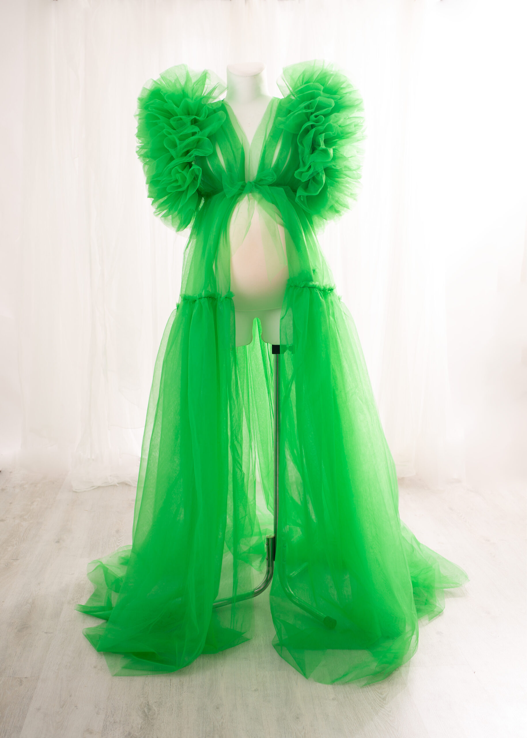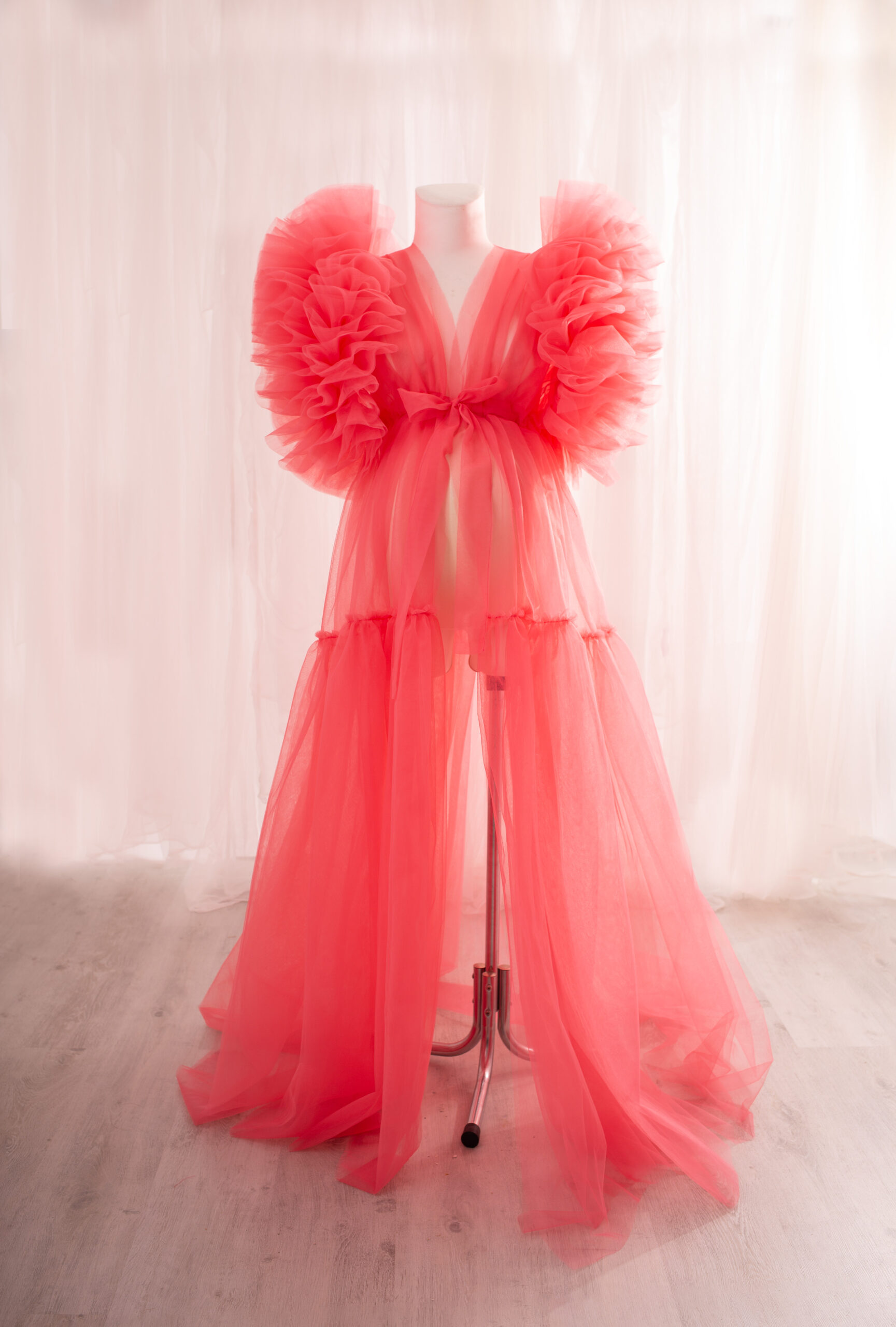 Aureola maternity dress made of a very good quality tulle. The dress is one size. It is like a baggy coat with a belt to wrap on the waist. You can make it more tight or baggy. There is double-breasted thick tucked flounces on the shoulders. They make dress looks unique and stunning. I can really recommend this dress-coat. The dress can be made in a few colours.