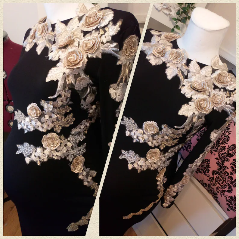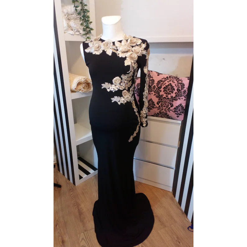 The dress is made of an elastic jersey. The fabric is a very good quality, stretching a lot. The dress is tight-fitting. Top of the dress is covered by amazing sparkling gold flowers. The dress has only one long sleeve. It is covered by gold flowers too. The dress looks chic and elegant. There is two of colours : red and black. It does not matter what of colours you choose, flowers are still gold. I offer two sizes. To choose your size just measure your bra. It is a very unique model of the maternity dress.