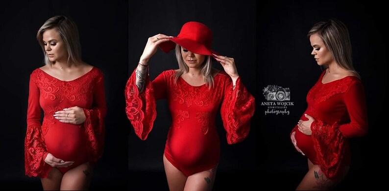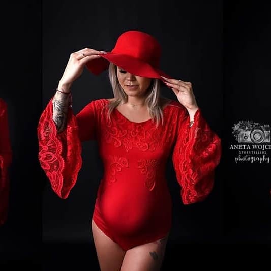 A bodysuit is made from a jersey. It is stretching a lot. Sleeves are made from a beautiful lace.
