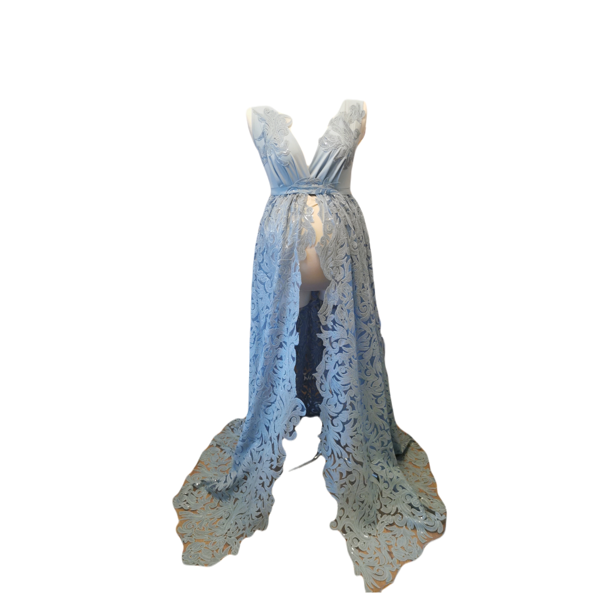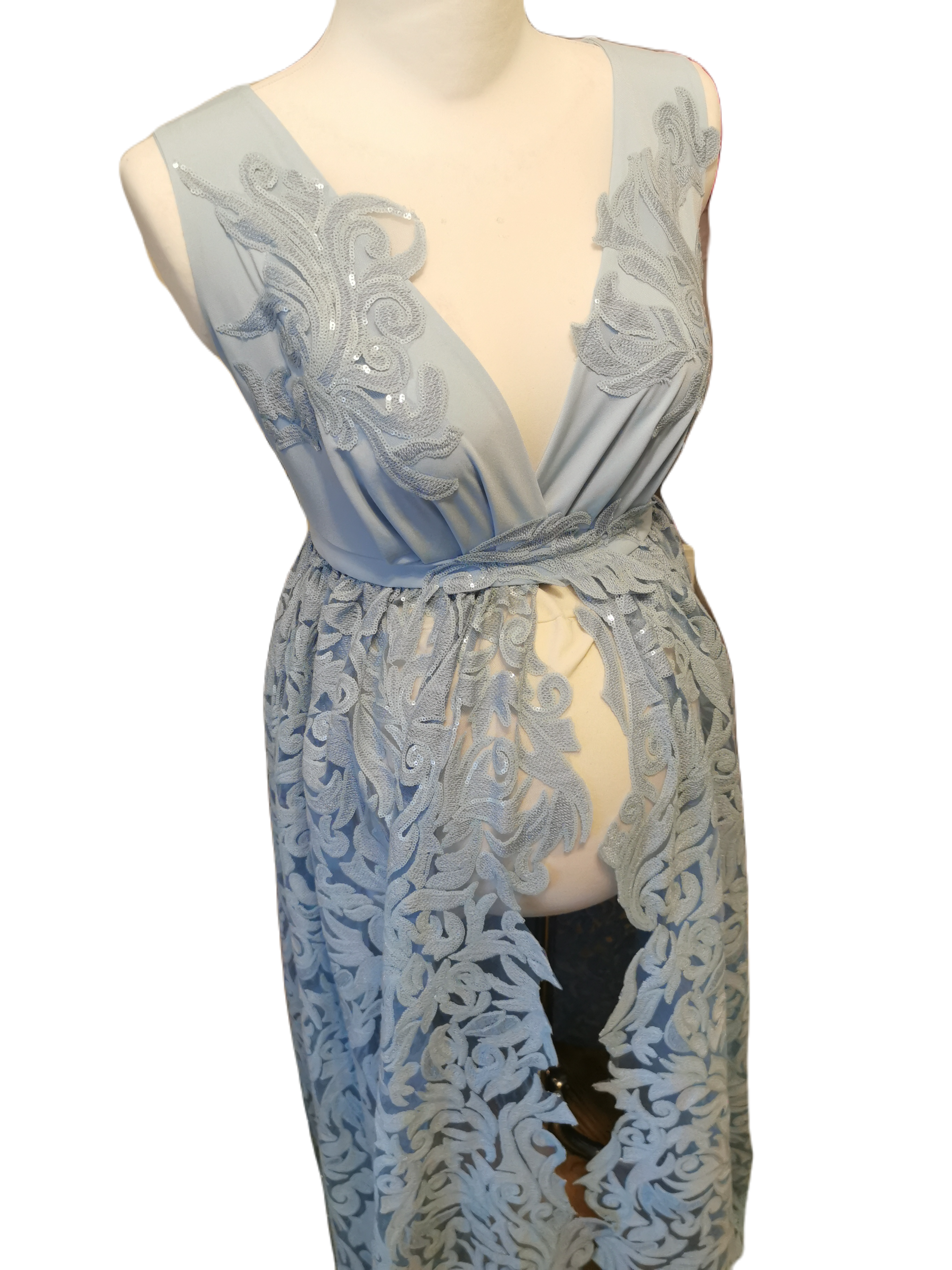 Mirabella maternity dress made of a beautiful guipure lace with sparkling sequins.  The lace is a   very good quality with a really unique gorgeous floral pattern.  The top of the dress is made of an elastic jersey covered by cut guipure lace which makes shoulders and neckline looks beautiful.
