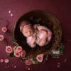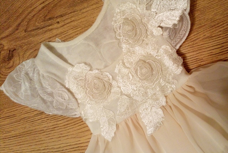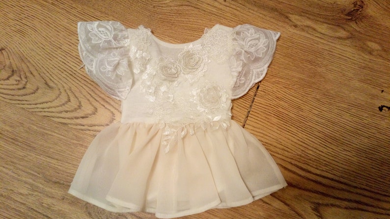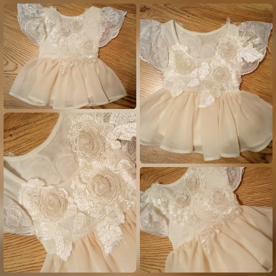 A newborn baby girl dress made by jersey and chiffon.  Beautiful flowers on the front and on the back of the dress.